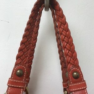 Isabella Fiore leather unique deep orange handbag 👜 with a lot of details ,braided double handles 10" long the bag measures 14"x8"x6/5". Three inside pockets includes dust bag , worn once