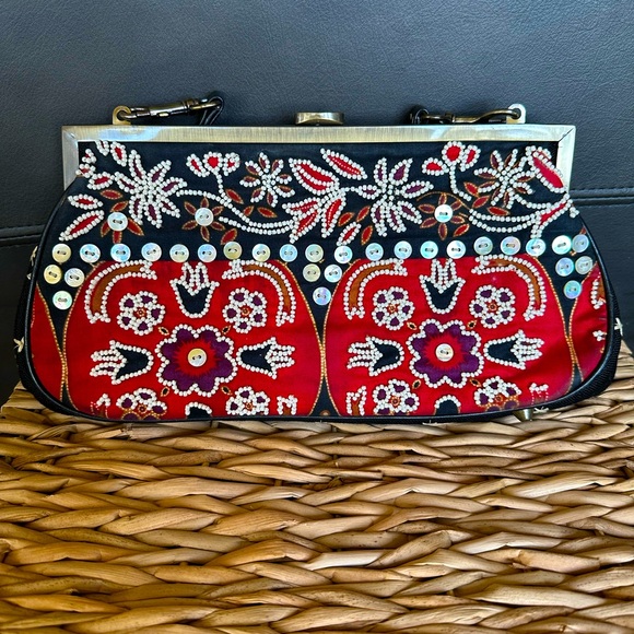 Leather strap with decorative white criss cross stitched as well on the sides of bag