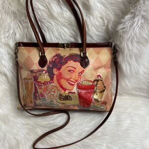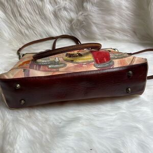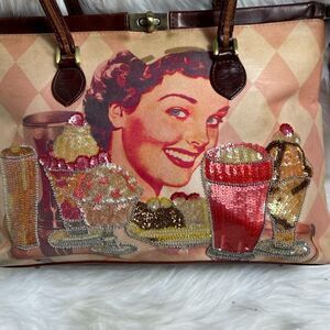Isabella Fiore vintage fabric and leather shoulder with sequins dinner design double leather traps lock closure the inside lining has a side zipper two side pockets pre owned in good used condition no tear small wears stains on the fabric see all pictures any questions please message