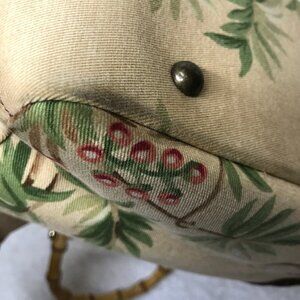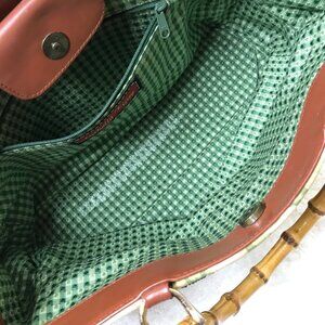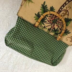 Fabulous bamboo handled retro style reminiscent of the 1950's. Front side has beautifully beaded palm tree and coconuts. Top magnetic snap closure. Substantial inside green gingham lining is clean and in good condition with one zip pocket. Exterior shows signs of use at bottom corners. There is one small mark toward the bottom of right side. While in reasonably good condition for a vintage bag, the appearance may be even better with a professional cleaning. See photos for details. Otherwise in good vintage pre-owned condition.