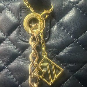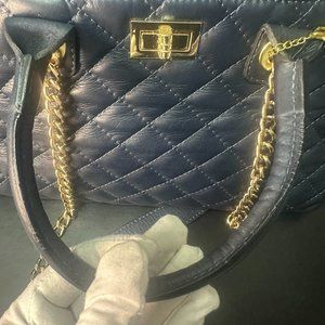 Isabella Rhea Leather Chain Strap Satchel -Dual rolled top handle with dual chain shoulder straps - Foldover flap with magnetic closure - Exterior features turn lock closure detail, quilted construction - Interior features zip wall pocket, 1 media pocket, 1 center zip compartment - Approx. 8" H x 13" W x 4.25" D - Approx. 4.75" handle drop, 11.75" strap dropChain/leather handle can be removedMaterials: leather exterior textile liningColor beautiful dark blueComes with dust bagMade in ItalyPreowned in like new condition. See photos. Retails $375