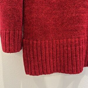 Sweater is made of 75% silk, 25% acrylic and 5% metallic thread. Normal wear of organic fibers to be expected. Comes from dog friendly home.