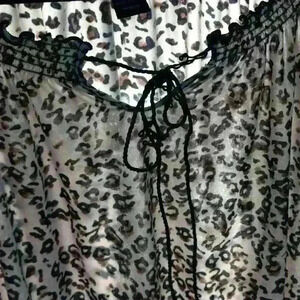 this is an Isabella Rodriguez leopard print top size PL polyester and spandex blend elastic waist and sleeves Longline tie-neck pre-owned good condition