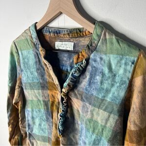 Anthropologie Isabella Sinclair Plaid Flannel Top Great acid wash look to the plaid pattern in blue, green, tan and brown Fabric is a light flannel V-neckline with buttons and ruffle detailing on one side High-low hemline 100% cotton
