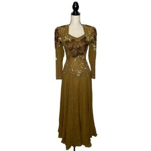 Vintage-inspired, earth-toned formal gown with intricate embellishments and a regal silhouette. The dress is crafted from a flowing, lightweight fabric in a muted golden-brown shade, exuding an antique elegance. It features a fitted bodice with structured shoulders and long sleeves, giving it a refined, almost Victorian-inspired aesthetic. The square neckline is adorned with detailed embroidery and sequin embellishments in rich bronze and gold hues. The upper portion of the gown is intricately designed with beaded floral appliqués and shimmering sequins, concentrated around the bust, shoulders, and sleeves. The beading extends to the waistline in a structured, corset-like design that accentuates the natural curves. The embroidery and beading continue subtly onto the sleeves, which are semi-fitted and slightly sheer. The back of the dress mirrors the front with its ornate detailing, featuring a high backline and a seamless continuation of the intricate embellishments. The waistline is emphasized by an ornate, pointed basque design, which extends into the flowing skirt.