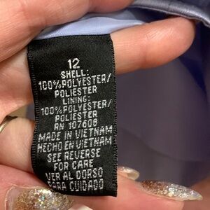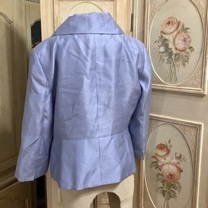 Beautiful blazer with three-quarter inch sleeve has a beautiful sheen and a light sky blue perfect for this summer has slight split on each to give more comfort beautiful iridescent, blue buttons, light padded shoulders the new in wide lapels fully lined