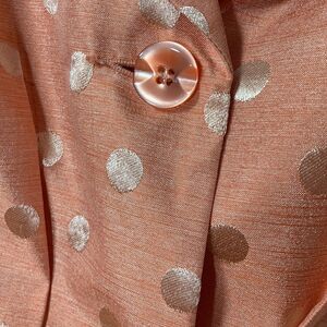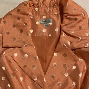 Isabella size 14 W womens two piece suit peach/orange color & polkadot top. Perfect for mother of the groom or bride. This is coming to you having been worn only once. Has never been washed. Smoke free and pet free. See all photos for complete description/details.
