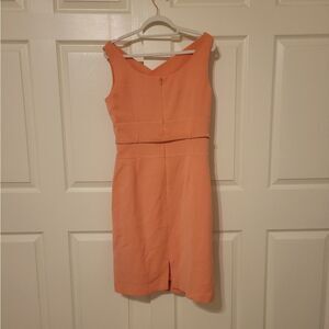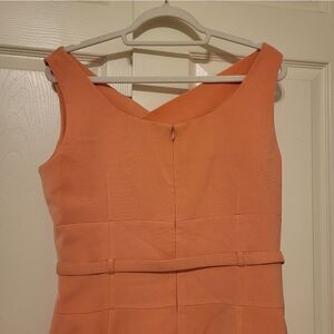 Isabella DeMarco light peach sleeveless belted midi dress, size 10, cross over of material over bust, lined, lining is sewed in with the back of the dress, slip clip zipper closure in back, slit in center at hem, slightly stretch material, shell: 64% polyester 33% rayon 3% spandex, lining: 100% acetate, excellent condition.