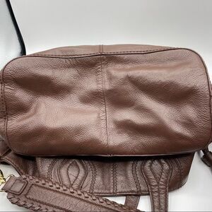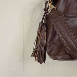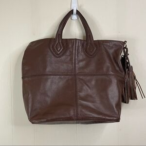 This gorgeous leather bag is in excellent pre-owned condition. The outside of the bag is free of scratches and flaws. The bright blue canvas inside shows a tiny bit of use, but is in amazing condition. It has handles and a removable shoulder strap. It has gold hardware and an oversized double tassles on the side. It is approximately 17 1/2” x 14” x 7”… large enough for a laptop!