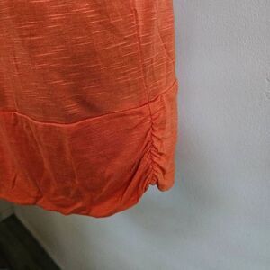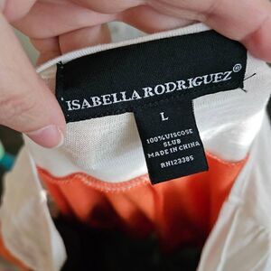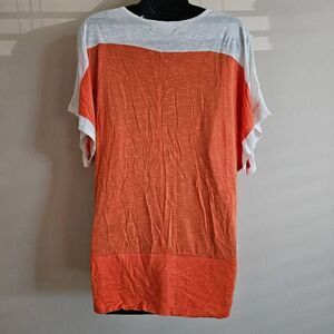 This is a short sleeved blouse by Isabella Rodriguez. It is orange with a cream colored cowlneck style neckline.