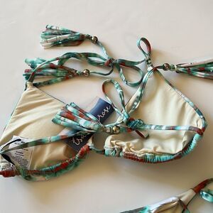 Make a splash in this triangle bikini top styled with dainty tassel ties and festive bead accents.