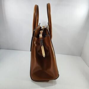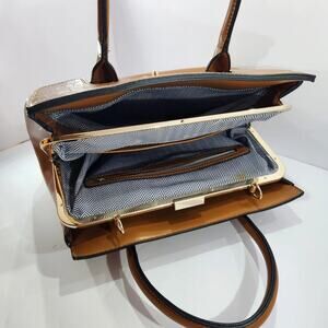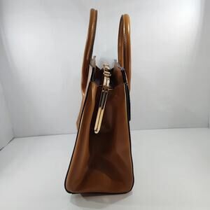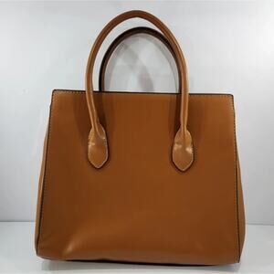 Isabelle $47 Caramel Brown Vegan Leather Handbag Pocketbook Middle Clam Shell Closure
