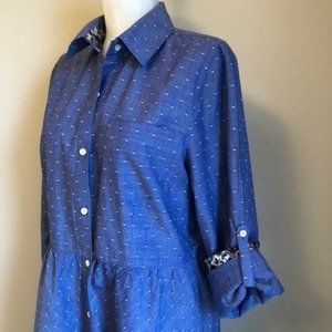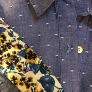 Chambray blue with white dots cotton tiered high-low hem cottage core Isabelle Sinclair shirtdress from Anthropologie. This cutie has dart detail and roll-tab sleeves and features a floral print contrast fabric inside the collar and sleeve. It has belt loops but is missing the lace belt it was sold with. Gently warn with no flaws.