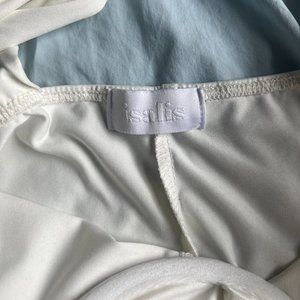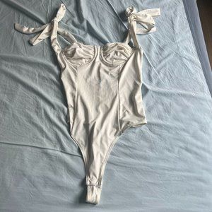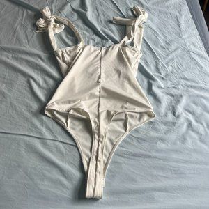 Super cute bustier bodysuit in ivory has under bust wiring so it's structured at the chest area, ties on top of the shoulders so adjustable to your liking and thong style bodysuit with buttons on the bottom