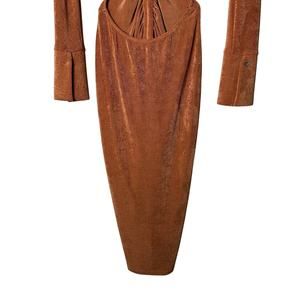 Isalis Dress Midi Button Down Front Split Back Long Sleeve V Neck Ruched Copper Metallic Sheen