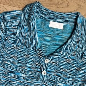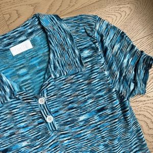 Blue short-sleeve dress with white buttons. Intended to hit mid to upper thigh depending on height.