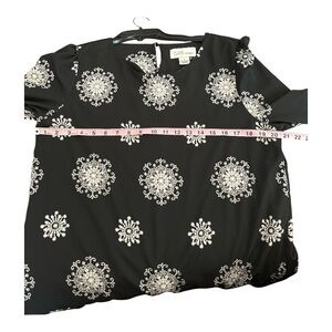 Chic black shift dress with elegant white medallion print and contrasting border detail. Features 3/4 sleeves, fully lined polyester fabric, and a back keyhole closure with button—crafted by Isani for Target. Pre-loved and in excellent condition.