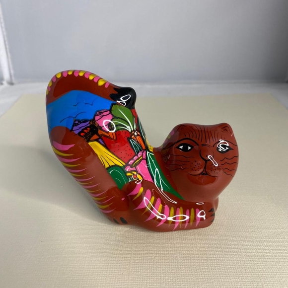 Isidoro Mexican Folk Art Hand Painted Sculpted Clay Cat Figurine.