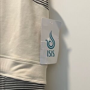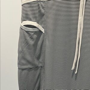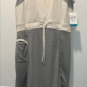 Stylish dress by Isis. Gray and cream stripes. Sleeveless with drawstring waist. Perfect for casual outings.