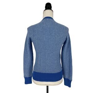 A soft and timeless cashmere V-neck striped sweater featuring a relaxed fit, ribbed trim, and contrast blue detailing at the neckline, cuffs, and hem. Lightweight, ultra-soft cashmere construction makes this an elevated everyday essential. Long sleeves. White with blue stripes and blue trim.