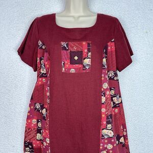 Island Attitudes L Red Patchwork Dress Fans Parasol Flora Linen Cotton Hawaii