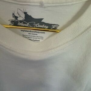 White long sleeve t-shirt with a small graphic design on the chest and back of the T-shirt. Sleeves have been cut to add a more subtle look. Island cowboy on Rt. Sleeve. Graphics on back of t-shirt.