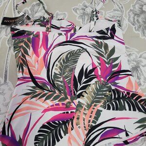 Island Escape Ruffled Tankini Swim Top. White with olive green, black, peach, pink leaves. Adjustable straps and inner shelf bra. Size 10. Show the Ellen Tracy bottoms listed and sold separately. Brand new with tags.