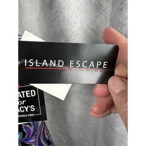This is an Island Escape women's high neck tankini in size 10 with a paisley print design. It features underwire support, padded cups, and is made of nylon material. The tankini comes in a multicolor scheme and is suitable for regular sizing.