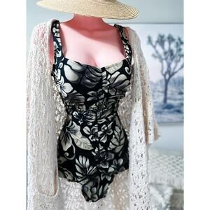 Turn heads and channel timeless elegance in this Vintage Glamour pin-up swimsuit. Featuring a bold golden hibiscus print against a classic noir backdrop, this one-piece hugs your curves with flattering ruching, a sweetheart neckline, and built-in support for a silhouette that’s pure Old Hollywood. With its tropical-meets-timeless vibe and high-glam shaping, it’s perfect for poolside lounging, beachside photoshoots, or sipping something cool with a red lip and retro shades. Think island goddess meets vintage siren.