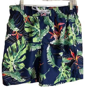 Tropical print men's swim shorts. These pants have pockets on the front and back. Drawstring closure with a mesh lining. Amazing condition
