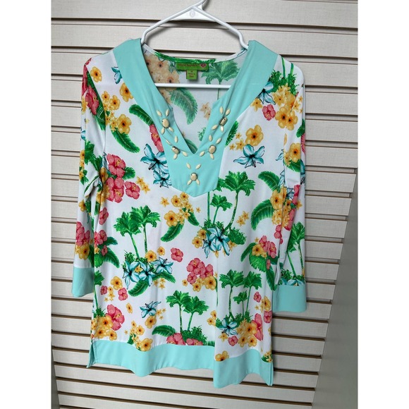Island Republic 3/4 Sleeve Floral Shirt Size M w/Beaded Accents at V Neck