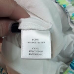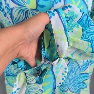 This Island Republic blouse showcases a vibrant blue and green color scheme with a relaxed, ruffled design. The 3/4 sleeves and lightweight fabric make it an ideal choice for a breezy, casual day.