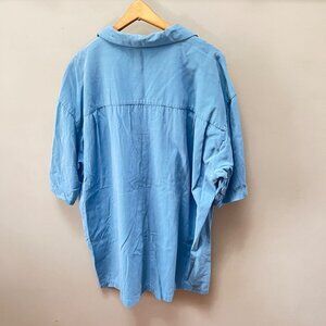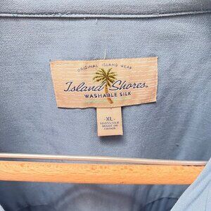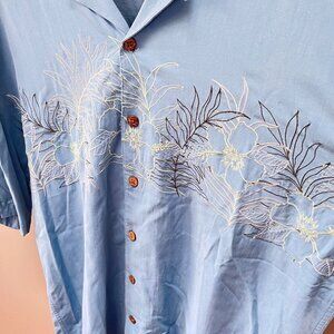 Island Shores Washable Silk Hawaiian Shirt- Size XL. Blue shirt with tropical foliage print on embroidered on chest area. In very good pre-owned condition.