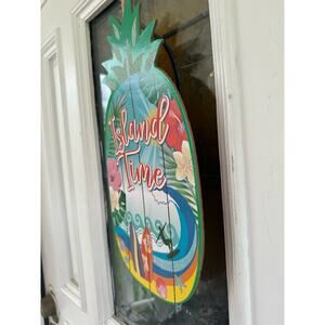 Embrace the laid-back vibe of the tropics with this eye-catching "Island Time" sign. Shaped like a pineapple and adorned with vibrant imagery, this sign features lush tropical flowers, colorful surfboards, and a silhouetted surfer riding the waves. The bright and bold design captures the essence of island living, making it a perfect addition to your home decor.