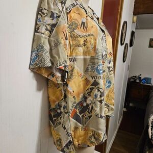 Short sleeve Island shirt with buttons down the front people ,floral Antigua etc Colors, yellow ,white ,lime green, grey, red and blue 100 % Rayon