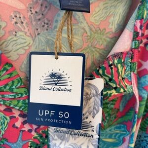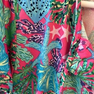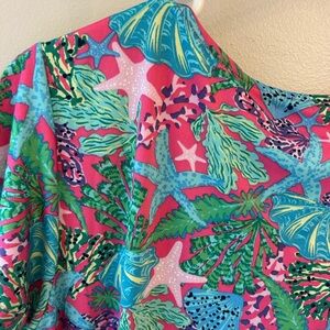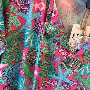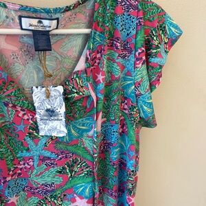 Brand new with tags this is a woman's size large fun summer bright colored floaty dress. Can be worn as a beach cover-up or out for a casual night. It has a straight fit with short sleeves. This is made of 90% polyester 10% spandex. Measurements are pit to pit 23 inches and overall length 36 inches