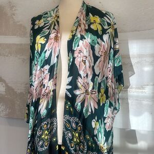 This floral kimono has a beautiful design with black background . The lightweight kimono has side slits and is a perfect match with our If Only Sleeveless Top in Banana.