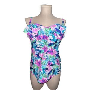 A soft ruffle and empire waist add a timeless feel to this Island Escape tankini top, a stylish swim look in a vivid floral print. Removable cups. Lined. Sweetheart neckline with ruffle. Pullover styling; adjustable over-the-shoulder straps.