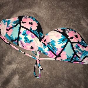 it’s in good condition i’ve worn it once! the top you can add strings to it, and the top is a size S and the bottoms are a M.