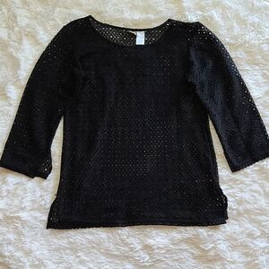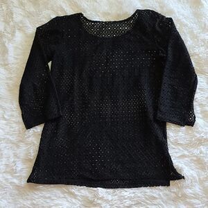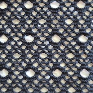 Black open weave pattern, openings in sleeve and sides at bottom of top