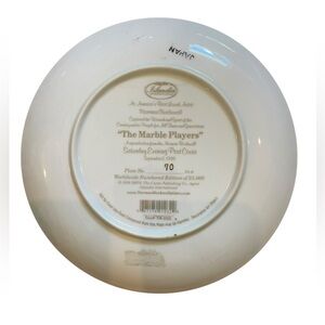 The image depicts a collector plate featuring Norman Rockwell's painting "Marble Champion," also known as "Marbles Champ". The painting, which originally appeared on the cover of the Saturday Evening Post on September 2, 1939, portrays three children engrossed in a game of marbles. A girl is shown intently aiming her marble, while two boys watch with anticipation.