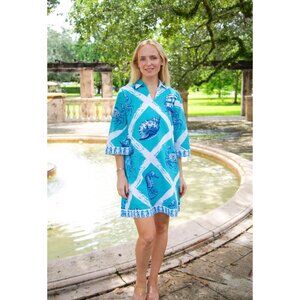 tags: designer, spring, summer, travel, vacation, beach, ocean, a-line, shirt dress, midi, mini, conservative, pretty, shells, sea shells, fish, nautical