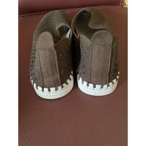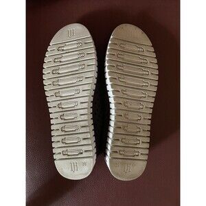 These shoes were worn once or twice and are in excellent condition. They are made from recycled microfiber, recycled stitching, no glue, laser cut pattern, flexible natural rubber sole.