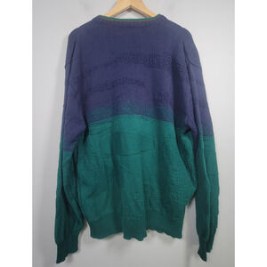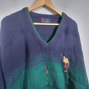 Isle of Cotton men’s sweater in size XL. 100% cotton, made in USA. Features a bold green + navy colorblock design with embroidered golfer and flag detail on the front. Classic V-neck knit, perfect for golf lovers or vintage streetwear style.