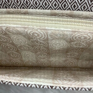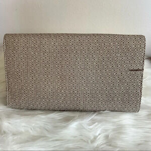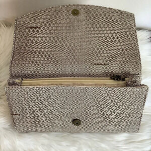 NWOT Isly brown and beige diamond print cloth clutch. Magnetic snap closure. Inside has a middle zip pocket and another zip pocket on the side. Fabric beige print lining. Never used. In new condition.