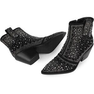 ✨ Isnom Ankle Boots Women Black Rhinestone Sparkly Pointed Toe Chunky Heel Boots