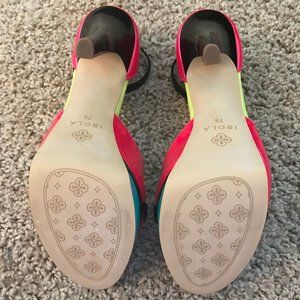 These heels have been worn once, but are perfect for a night out! They include adjustable buckles, dual-density comfort footbed, triple-layer wrapped platform, and the outsole has the signature Isolá design! The heel height is 4 ¾ inch heel with a double 1 1/4 inch platform.