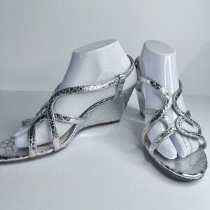 Isola Fidelia Metallic Faux Crocodile Silver 3” Wedge Strappy Heels Sandal Shoes Womens Sz 9 M . Very nice preowned condition. The inside of ankle straps are peeling lightly ( does not show when worn . ) Upper is in excellent condition. See pictures .