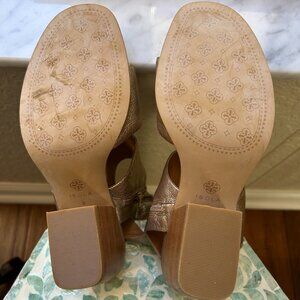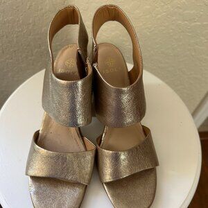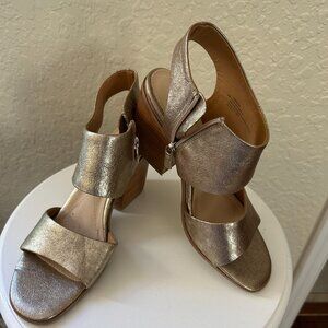Pair of open toe, gold leather sandals with faux wood block 3.5" heel and side zipper enclosure. Like new condition. Worn just once.
