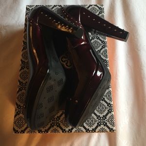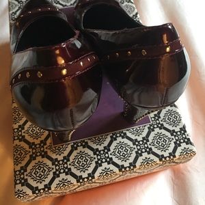 Beautiful patent leather pump in a deep red/crimson color by Isola. Size 7. Studded accents throughout the shoe. Never been worn. New in box.